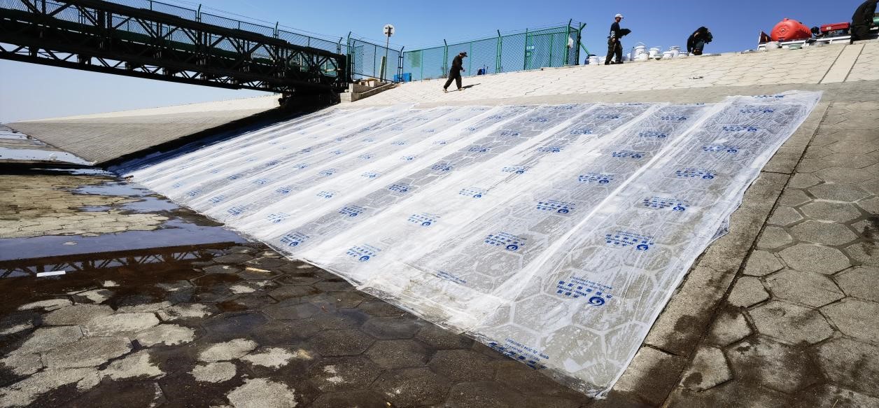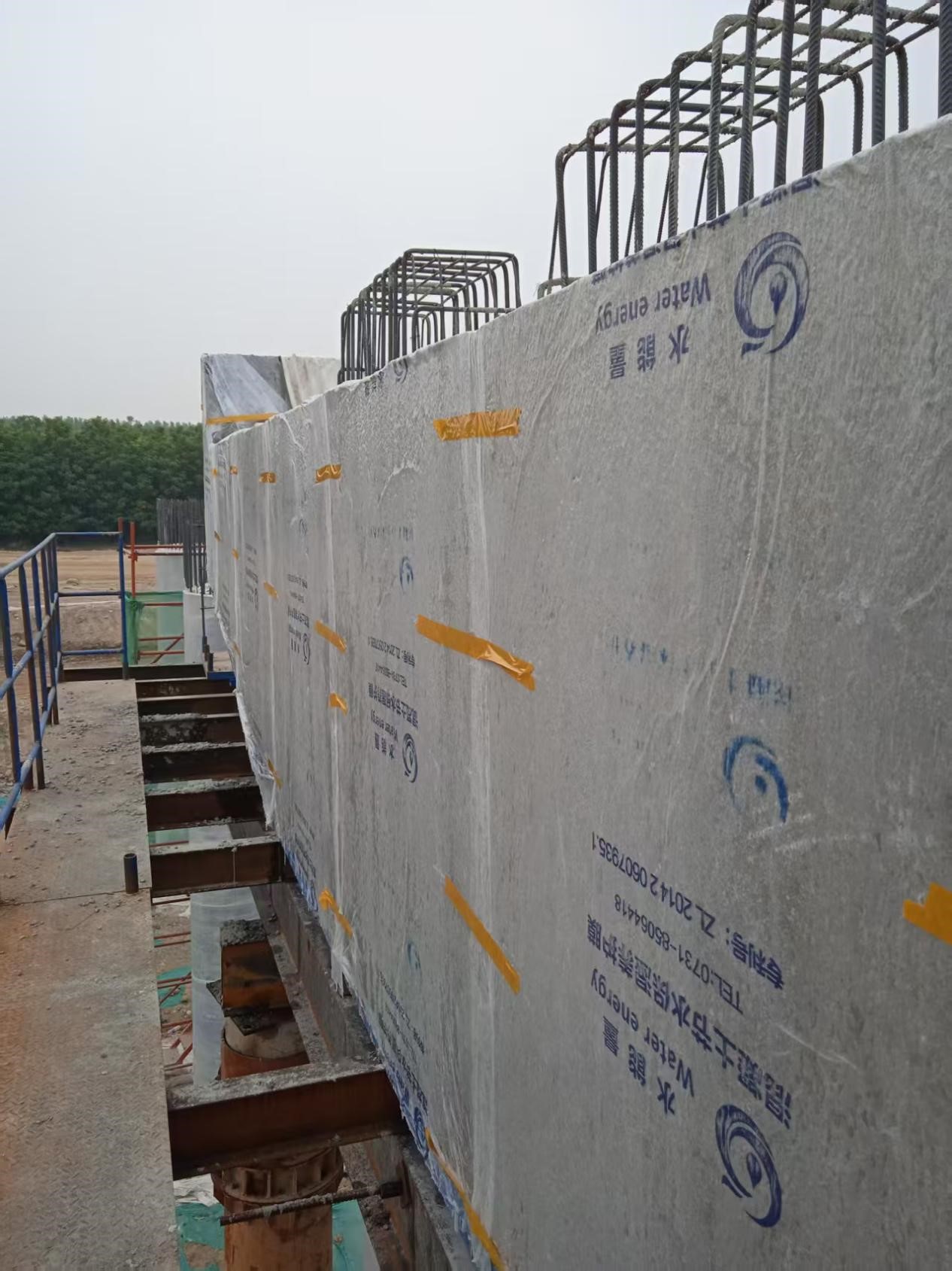 混凝土節(jié)水保濕養護膜,是以新型可控高分子吸水材料為核心,以塑料薄膜為載體,通過設備加工復合而成的卷材產品。其中高分子材料可吸收自重200倍的水分子, 吸水膨脹后變成透明的晶狀體,把液態(tài)水變成固態(tài)水,每平方米養護膜可蓄水0.5KG,成為一個固態(tài)的微型水庫,然后通過毛細管的作用向混凝土養護面滲透, 同時不斷吸收混凝土在水化過程中產生的蒸發(fā)水,因此在一個養護期內總能保持混凝土表面濕潤。